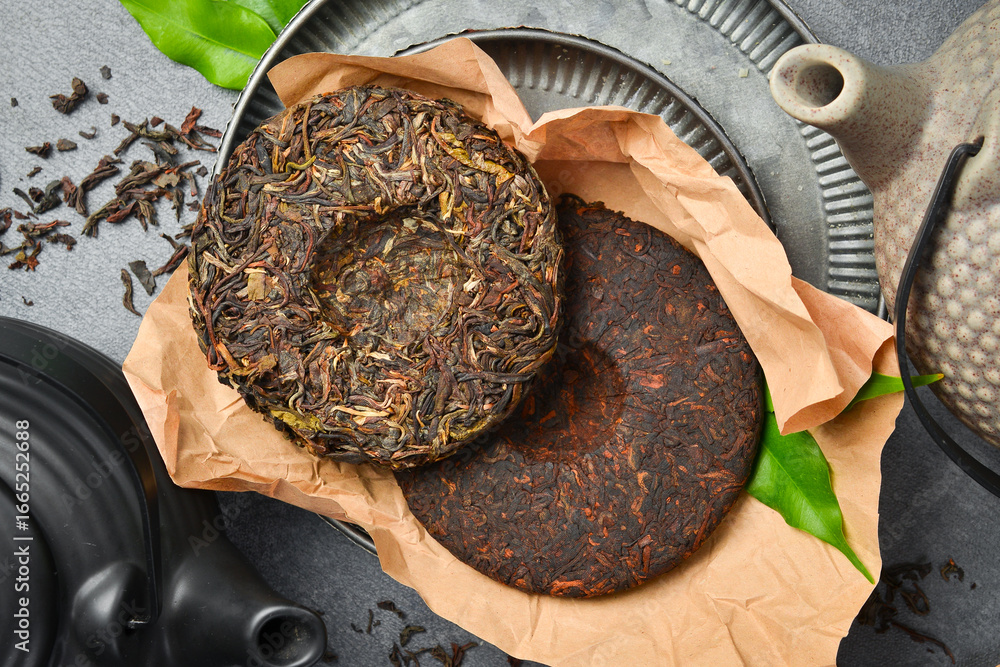 Tea ceremony. Pressed fermented Pu-erh tea, preparation for making tea.