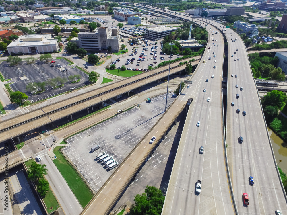 Aerial view highway I45 (Gulf Freeway), asphalt elevated road and Bayou River in downtown Houston, Texas, US. Passenger cars, trucks commuting daytime. Parking garage and office building in background