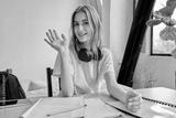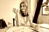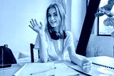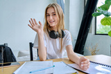 Webcam portrait female college student, sitting at home at the table with textbooks