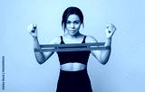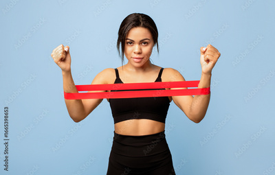 Strength and motivation. African american sportswoman doing exercises for hands, working out with resistance band on blue background and looking at camera