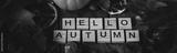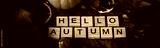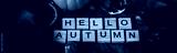 Hello autumn text on dark wooden background. Composition with bright autumn leaves, pumpkin, dry citrus, walnut. Cozy fall mood concept. Flat lay, close up, top view, macro banner