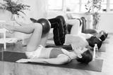 Multinational women and men is doing pilates in studio. People lie on their backs holding a soft ball pilates in their outstretched legs