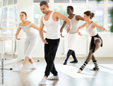 Motivated young adult man participating in group ballet class, practicing graceful dance movements in bright choreography studio with natural lighting..