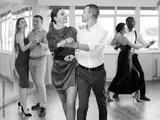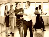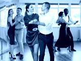 Dance studio - a group of beautifully dressed people learn to dance tango