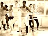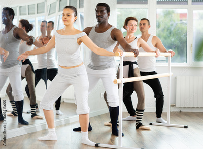 Graceful women and sports men practice at ballet standing at barre in choreography studio