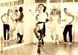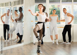 Adult female teacher showing ballet moves to group of multinational male and female dancers in studio