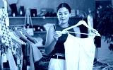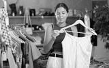 Near clothes rack, girl buys crop top, chooses clothes. Discount season, promotional offers. Woman of fashion near showcase chooses summer clothes, examines goods..