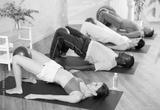 Group of adults of different nationalities doing core training with bender balls at gym. Focus on positive sporty young woman. Healthy lifestyle and pilates concept