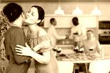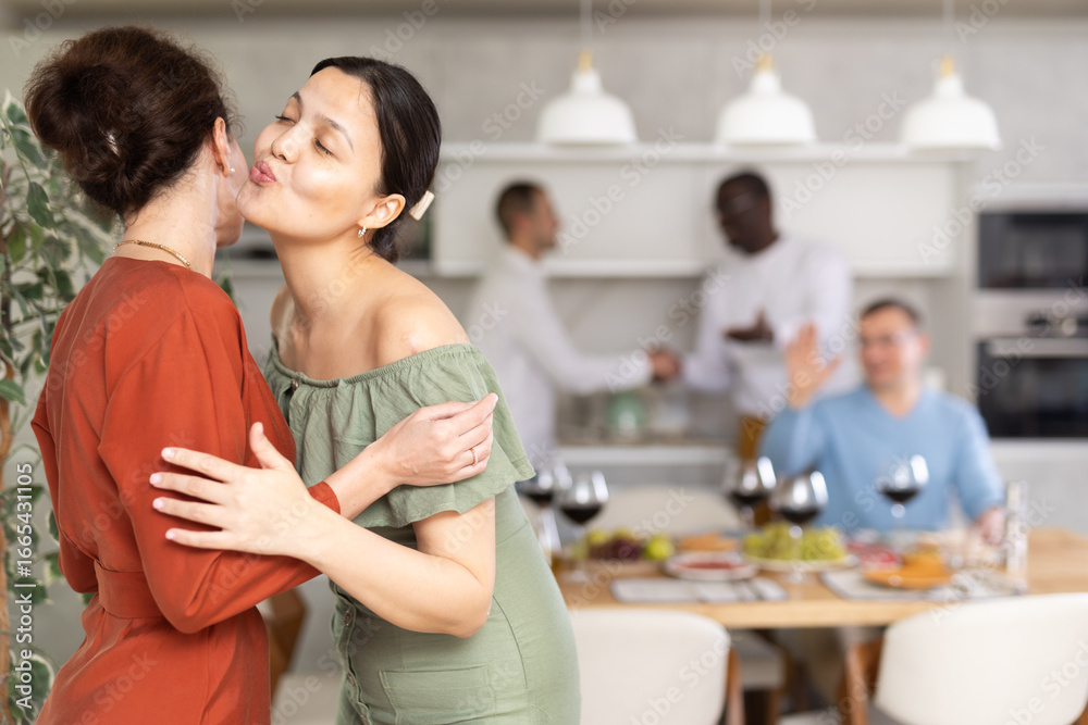 Pleased middle-aged hostess meeting her female friend during get-together at cozy house atmosphere