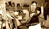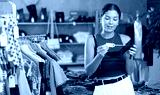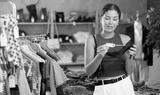 Girl customer choose high heels shoes in store, and buyer carefully examines product. Megamall, branded clothing store, franchise. Young woman enjoys shopping for stylish summer clothes.