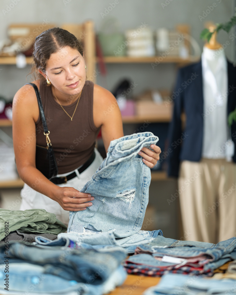 Interested brunette chooses high-quality jeans in a clothing store, she reads the composition and looks at material. Woman in a boutique buying denim clothes