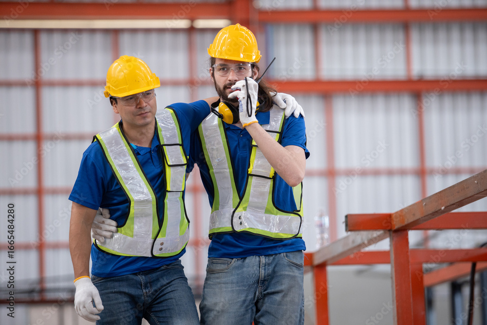 Construction worker supports injured colleague while calling for emergency help in warehouse. Workplace injury recovery, teamwork, and industrial safety response concept.
