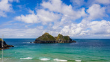 Aerial daytime view of Holywell Bay beach with Gull Rocks in Cornwall, UK
