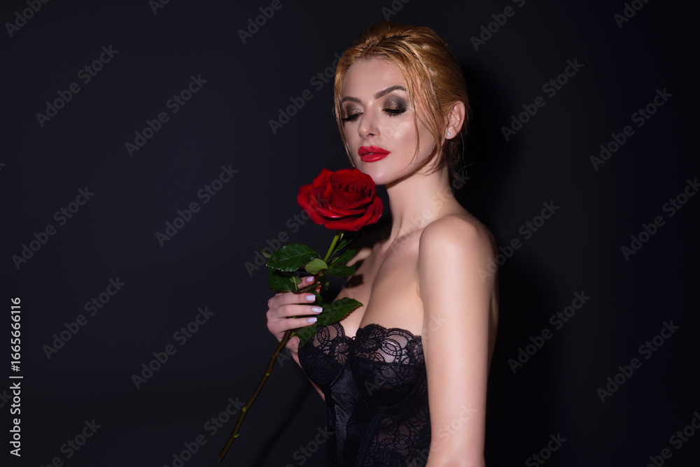 Portrait of attractive lovely charming dreamy girl holding red roses, isolated on black studio background. Romantic dating or proposal.