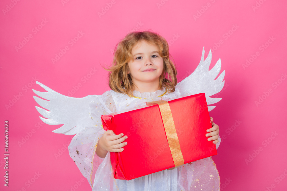 Kid boy angel with gift box present. Valentines day. Kid with angel wings. Studio portrait of angel child on studio color isolated background with copy space.