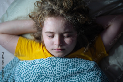 Child sleeping in a bed. Cute kid sleep. Kids pillow and blanket for sleeping. Little boy sleeps. Adorable kid sleeps in bed. Sleeping child. Kid sleeping in dark bedroom.