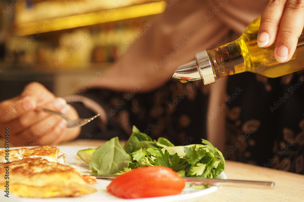 A person adds olive oil to a fresh salad on a dining table