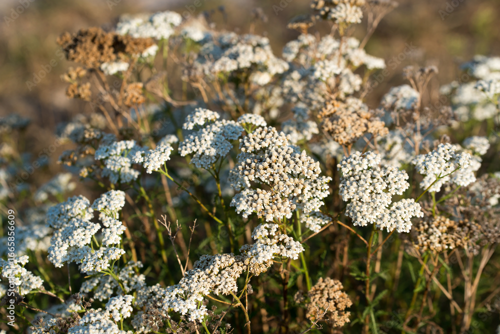 Achillea millefolium, common yarrow white flowers closeup selective focus
