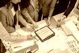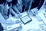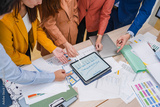 Business meeting showcases agile brainstorming with data analysis charts on tablets. Financial growth prediction strategy through predictive analytics and data-driven insights for strategic business