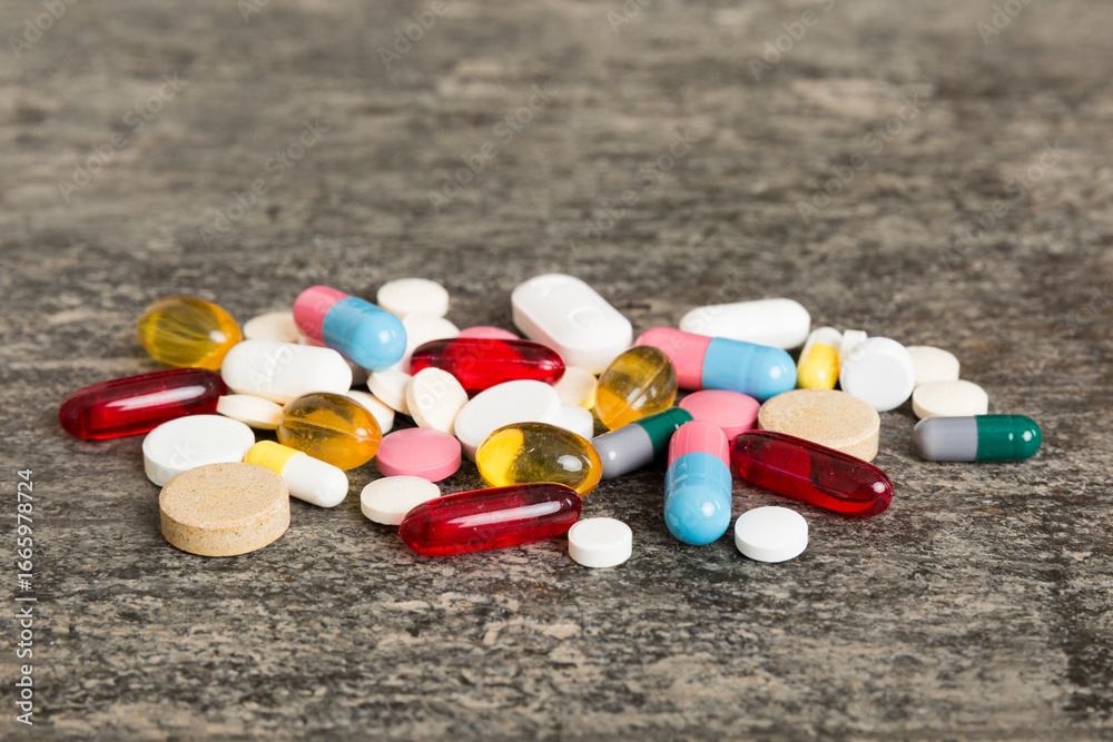 Collection Of Various Medical Tablets And Pills. Assorted pharmaceutical medicine pills, tablets and capsules on table background. Heap of assorted various medicine tablets. Health care
