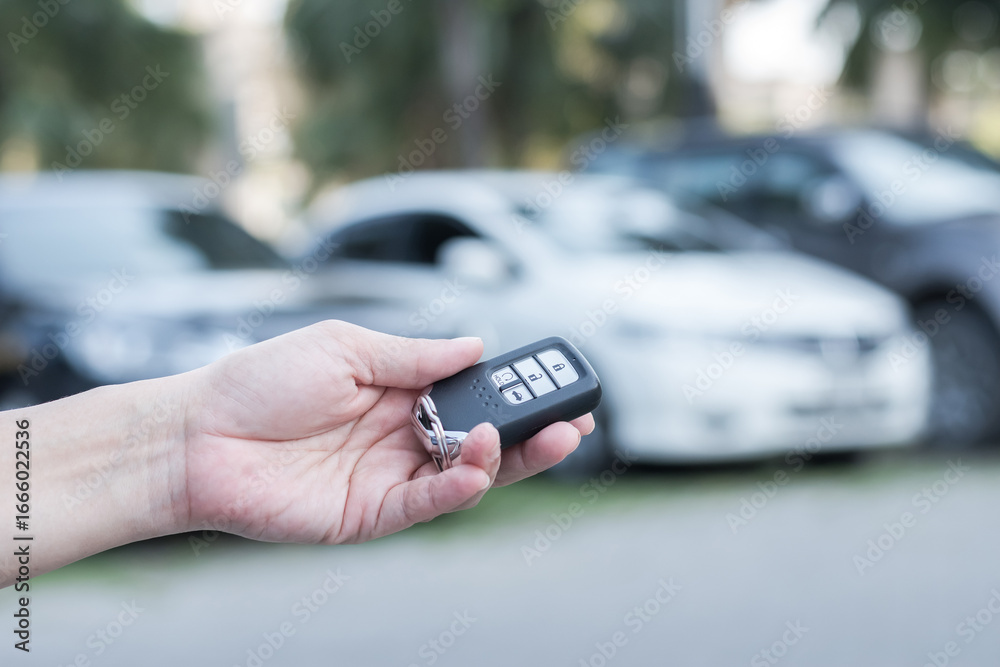 Car valet parking service, car buying deal or rental, automobile insurance business with owner or dealer handling vehicle remote key on parking lots or garage background