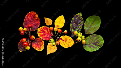 Colorful fall leaves and autumn berries arranged artistically on a black background.