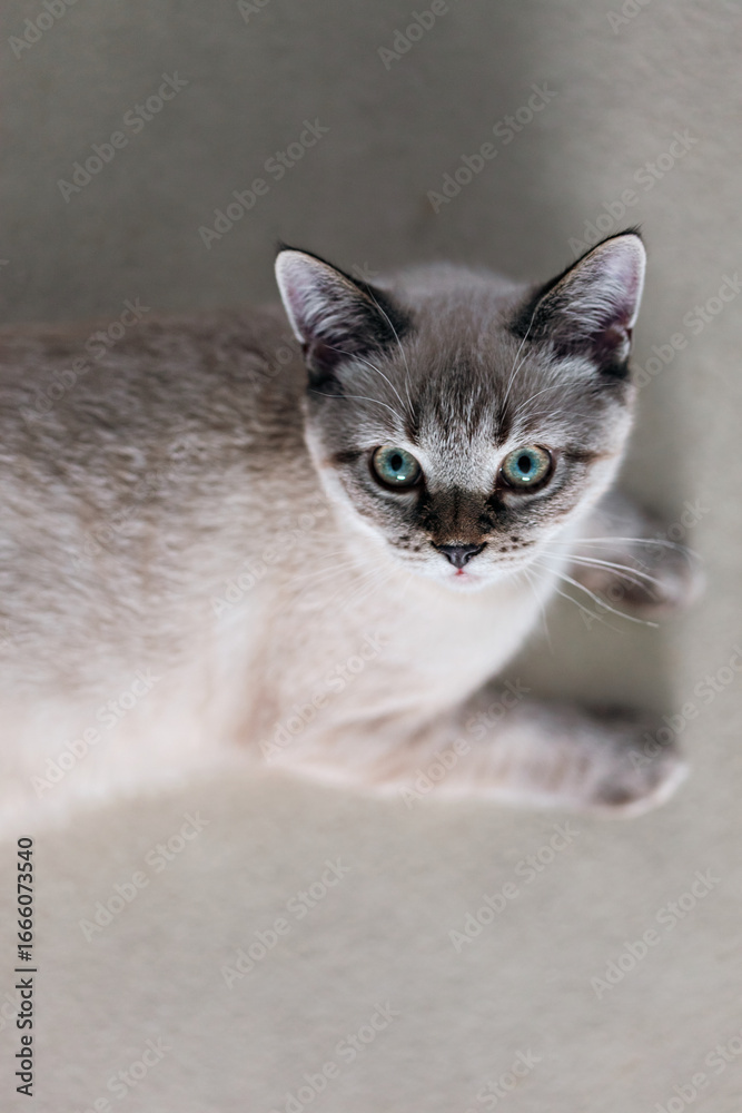 Light-colored cat with blue eyes staring upward while lying on a pale background. Scottish kitten
