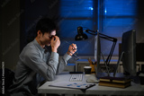 Exhausted office worker suffering from eye strain and stress during overtime work