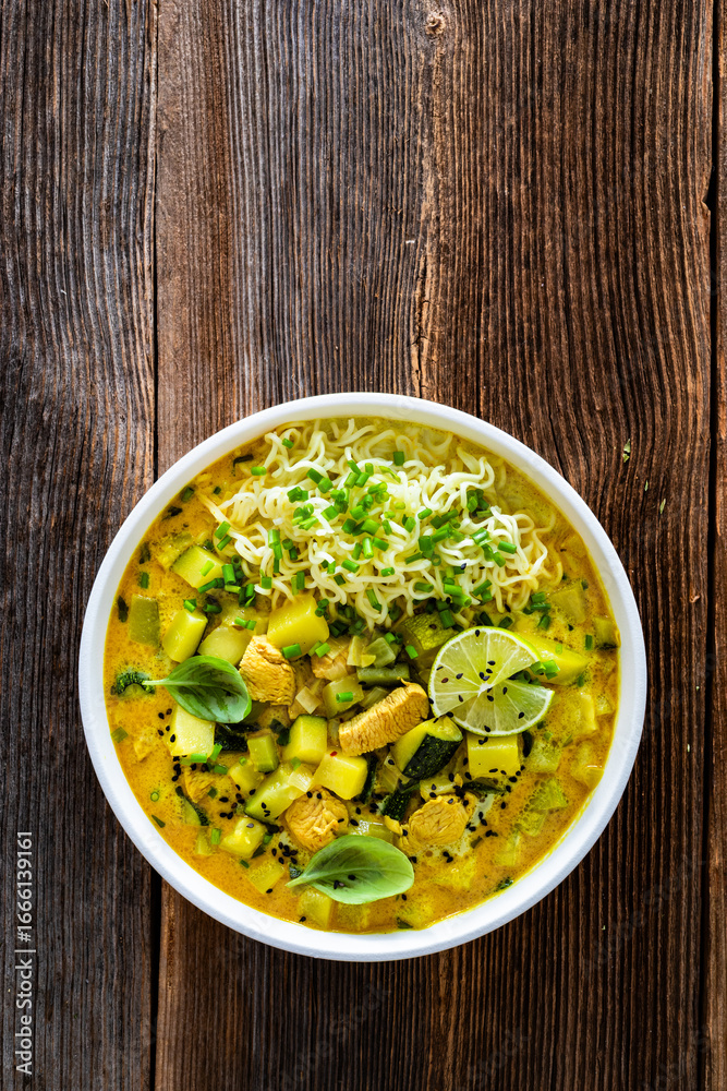Chicken curry soup with zucchini and instant noodles on wooden background
