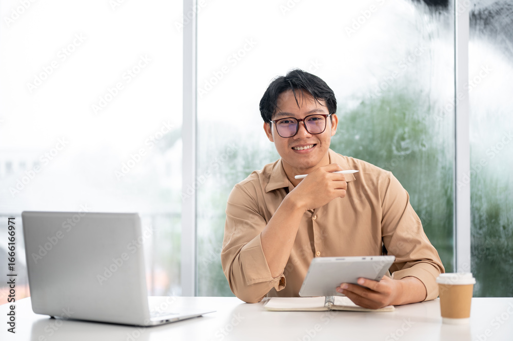 Businesswoman or office worker looking confused at tablet holding in a man's hand at working table.