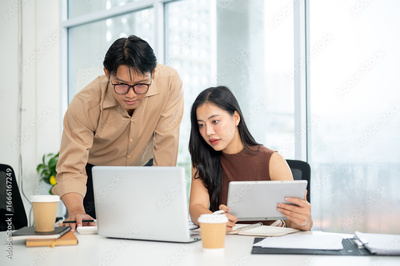 Businessman or office worker leaning over working table to look at laptop with woman holding tablet.