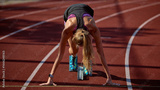 Female athlete stands poised at the starting block ready to sprint on a sunlit track. Concept of start focus, concentration, athlete in crouch position, preparation for sprint.