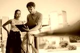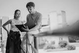 Two individuals are collaborating while reviewing documents on a sunny outdoor campus setting.