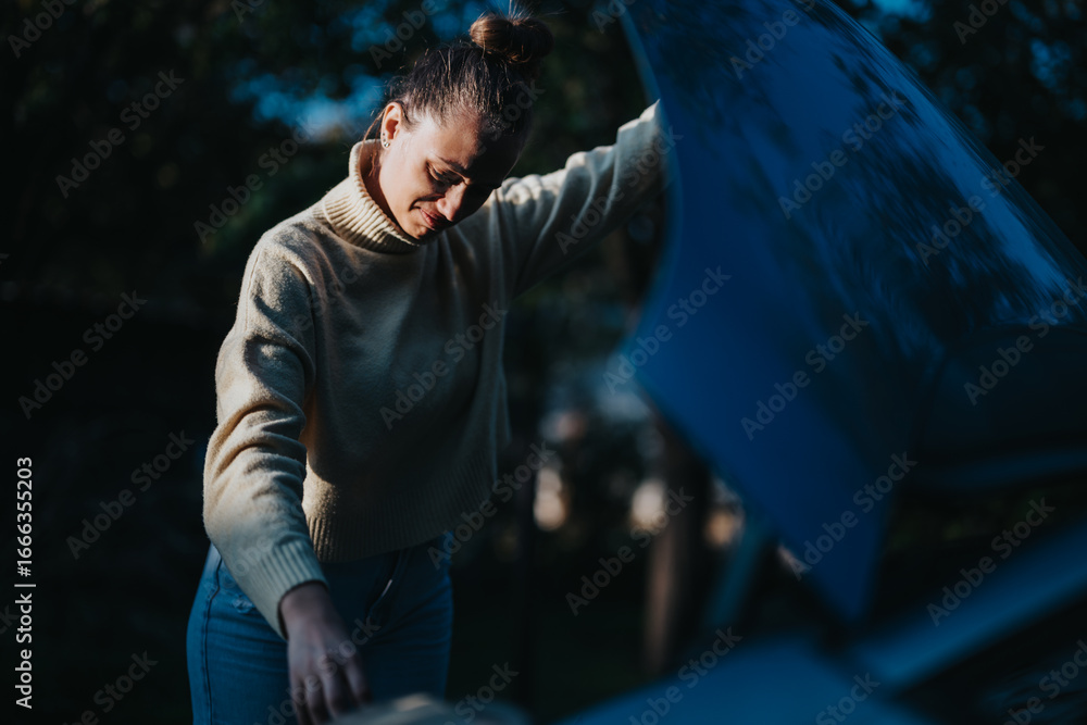A woman in a light sweater and jeans inspects a car engine outdoors. The sunlight creates a warm, natural ambiance. The image conveys themes of independence and self-sufficiency.