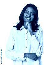 Portrait of a young Indian woman smiling happy and confident, touching chin with hand.