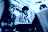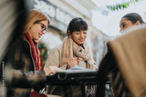 Three multicultural women interact at a cafe table, enjoying a professional and casual conversation outdoors.