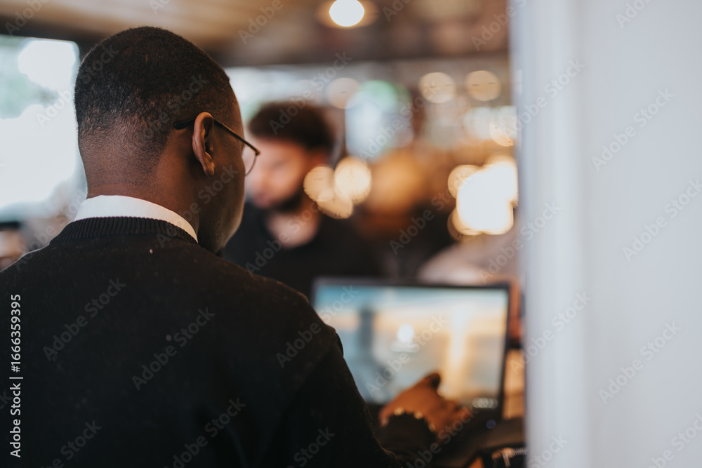 Man works on a laptop in a contemporary office with a blurred background, creating a professional atmosphere. Ideal for depicting technology, workplaces, and business scenarios in a corporate setting.