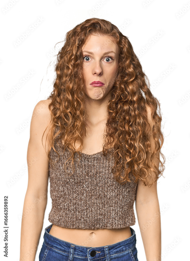 Simple redhead studio portrait shrugs shoulders and open eyes confused.