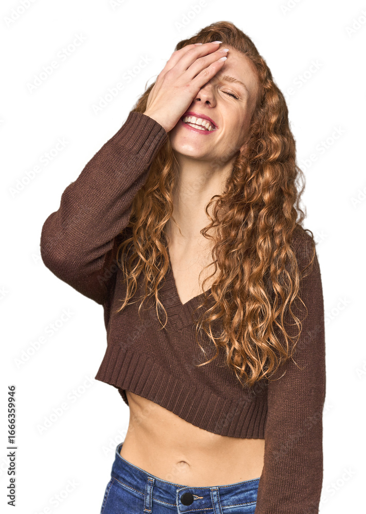 Simple redhead studio portrait laughing happy, carefree, natural emotion.