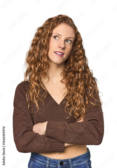 Simple redhead studio portrait dreaming of achieving goals and purposes