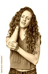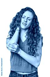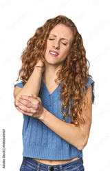 Simple redhead studio portrait massaging elbow, suffering after a bad movement.