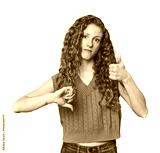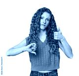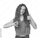Simple redhead studio portrait showing thumbs up and thumbs down, difficult choose concept