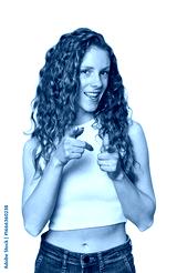 Simple redhead studio portrait laughs and closes eyes, feels relaxed and happy.