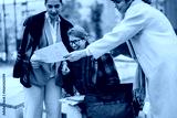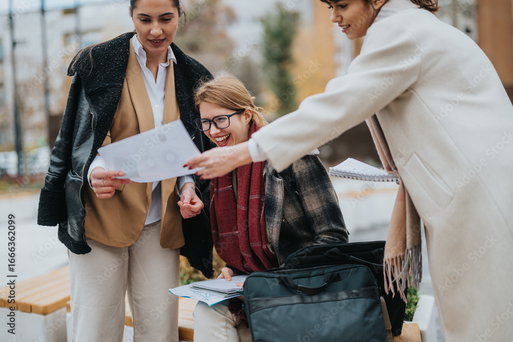 Three professional women working together on papers outdoors, showcasing teamwork and collaboration.
