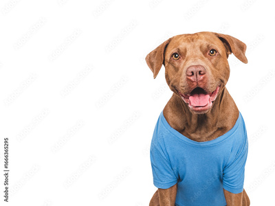 Stylish dog and blue t-shirt. Dog smile. Studio shot, isolated background. Closeup, indoors. Pets care concept