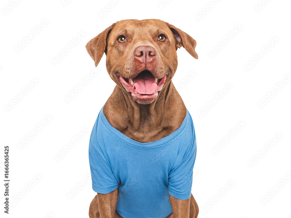 Stylish dog and blue t-shirt. Dog smile. Studio shot, isolated background. Closeup, indoors. Pets care concept
