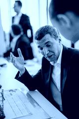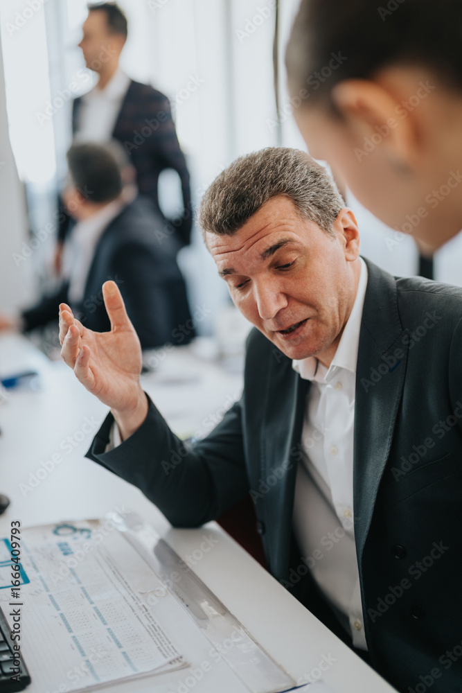 Group of people engaging in a discussion, analyzing documents, and sharing ideas in a modern workspace.