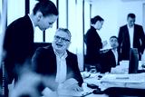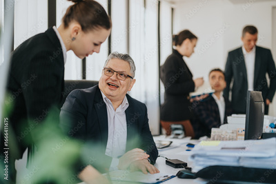 A team of business people collaborating and conversing in a modern office setting, conveying teamwork and productivity. The image portrays an collaborative atmosphere and mutual engagement within the