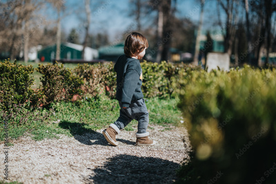 A young child walks on a sunny day in a peaceful park scene, exploring nature with greenery and trees in the background.