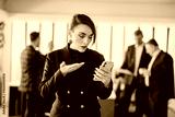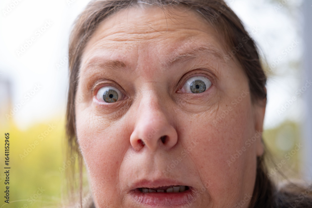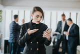 Businesswoman expressing surprise while checking phone, surrounded by professionals discussing work in background.
